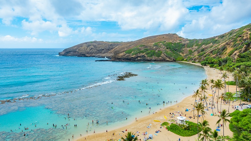 まずご紹介したいのが「ハナウマ湾」。ワイキキから車で約30分の場所にあり、全米No.1ビーチに選ばれたこともある人気のビーチです。